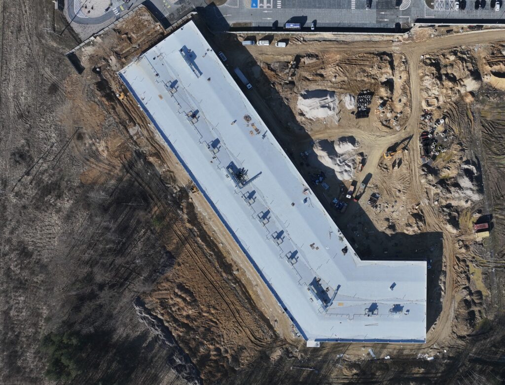 Na budowie przy ul. Ściegiennego widać wyraźne postępy – kończony jest montaż fasad, trwają prace przy instalacjach wentylacyjnych na dachu, a roboty wewnętrzne są już mocno zaawansowane. Najbliższe plany związane są z budową dróg i parkingów.